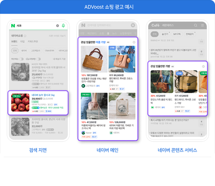 네이버 포털 메인페이지 및 제휴 파트너사 검색결과 페이지에 노출
